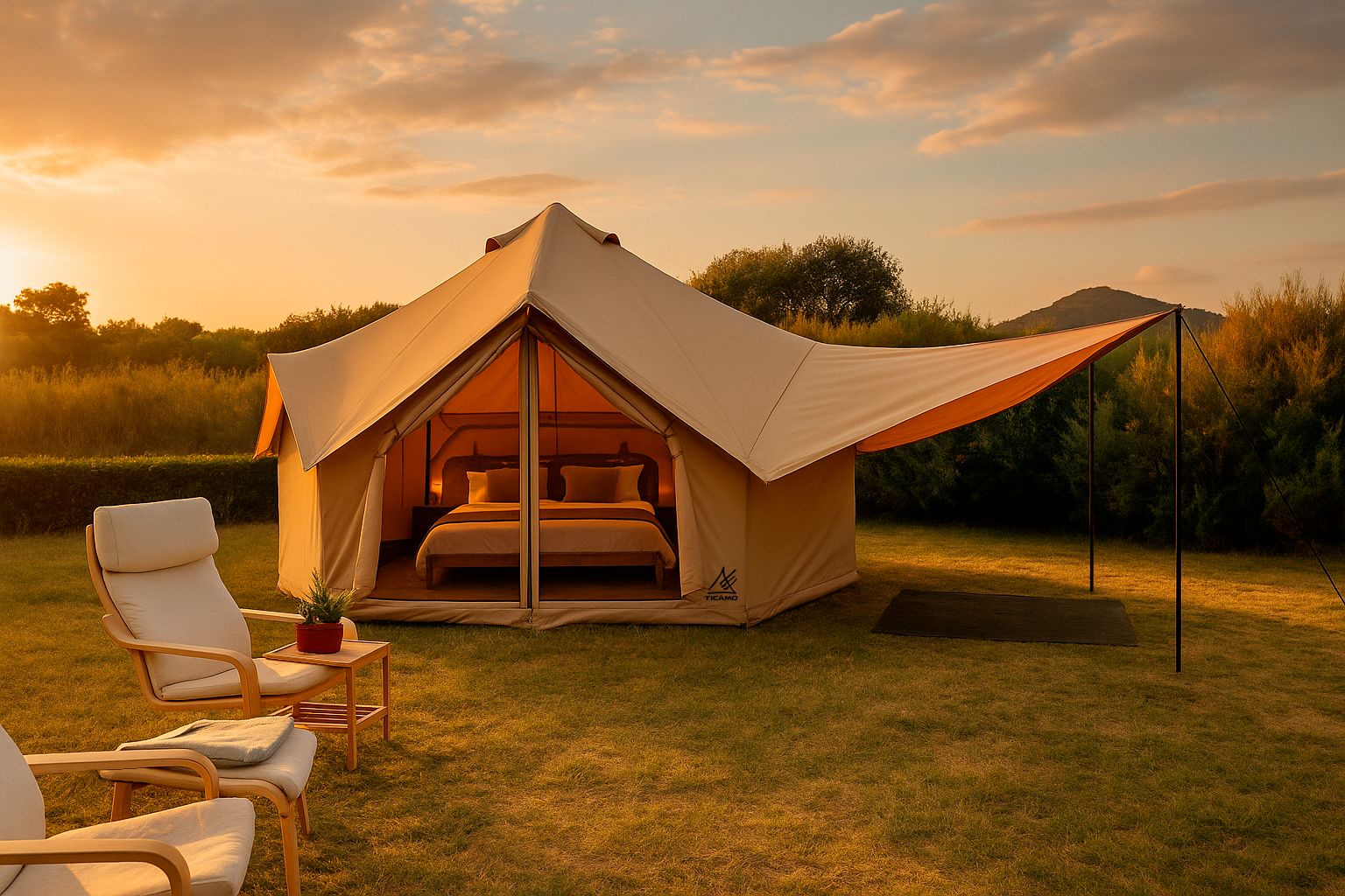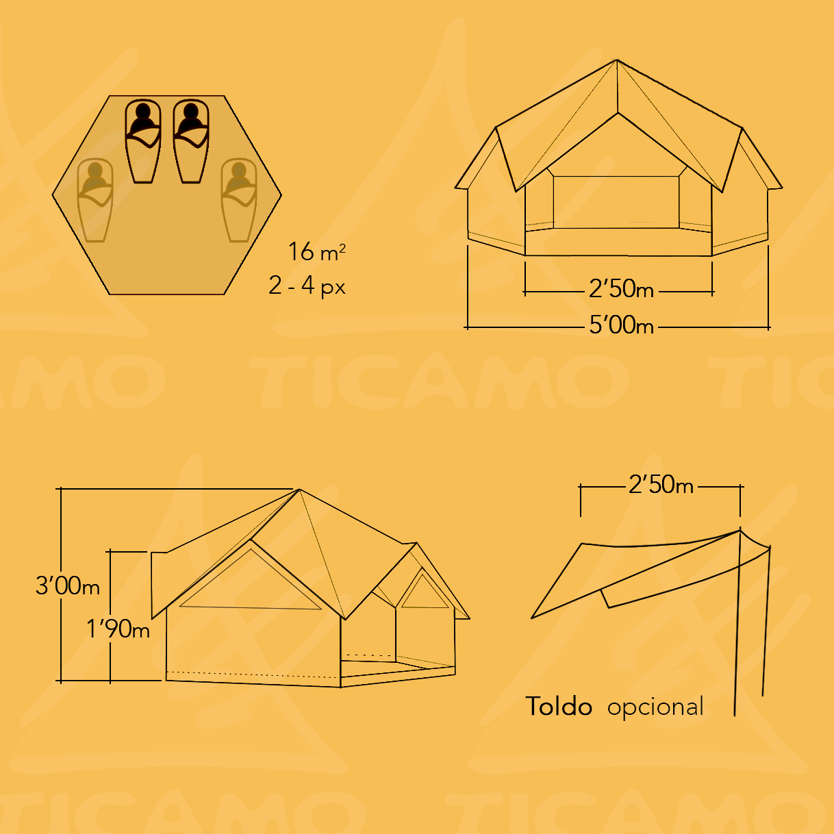 La tienda que redefine la "tipi" de una manera UNICA. Interior totalmente diáfano (sin mástil central), sin vientos exteriores para aprovechar la parcela de camping, estructura más reforzada y ventilación extra: 4 grandes mosquiteras con tapa + 3 respiraderos superiores. Lona TenCate de alta resistencia para exterior, toldo opcional y 3 configuraciones.